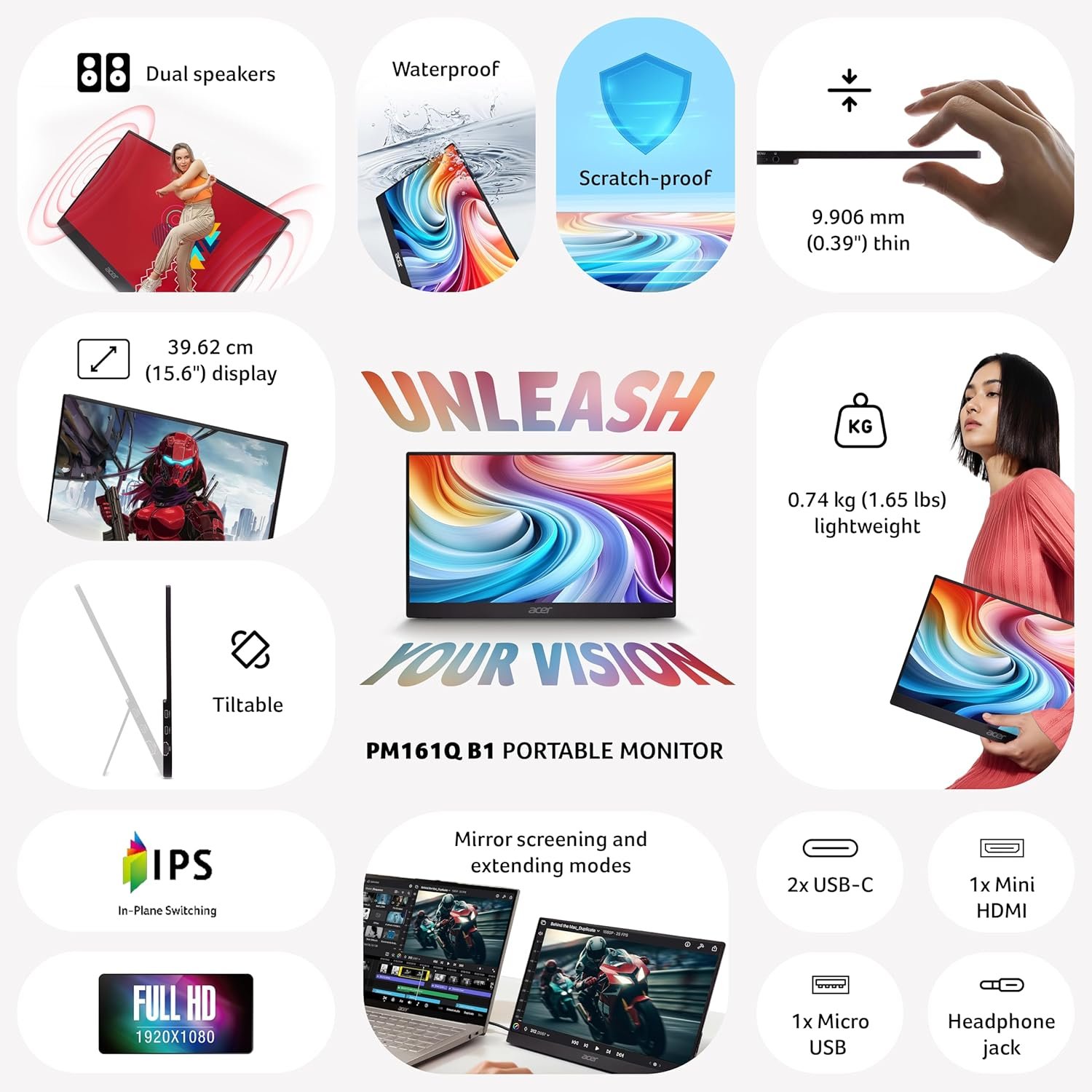 The Acer PM161Q B1 Portable Monitor is a lightweight and ultra-slim 15.6-inch Full HD IPS display designed for professionals, business users, students, and travelers who need a reliable secondary screen. Delivering sharp visuals, wide viewing angles, and versatile connectivity, this portable monitor enhances productivity whether you are working remotely, attending meetings, or traveling.