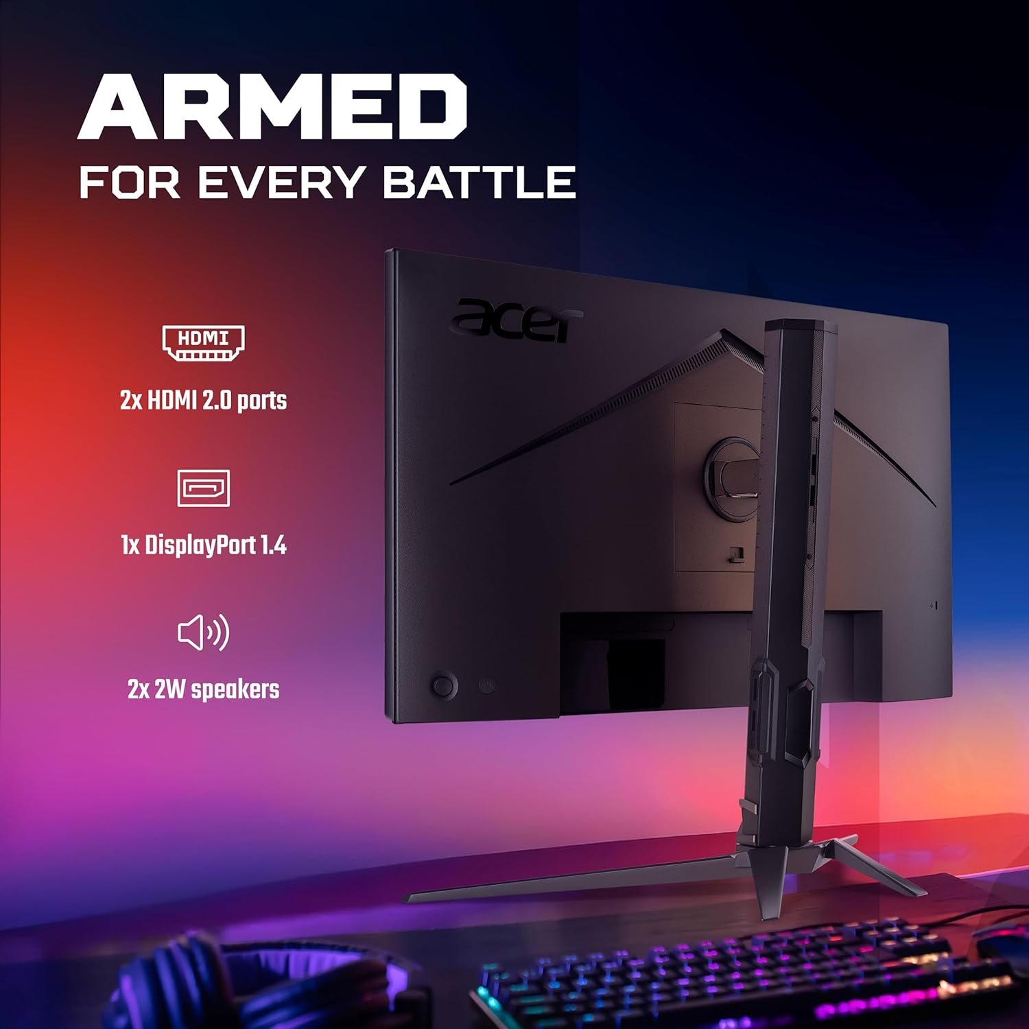 Designed for performance and comfort, the Predator ErgoStand allows full ergonomic adjustment including tilt, swivel, height, and pivot. With dual HDMI 2.0 ports, DisplayPort 1.4, audio-out, and dual 2W speakers, connectivity is seamless for gaming consoles, PCs, and streaming setups. Acer VisionCare technologies—Flicker-less, BlueLightShield, and Low Dimming—ensure reduced eye strain during long gaming sessions.