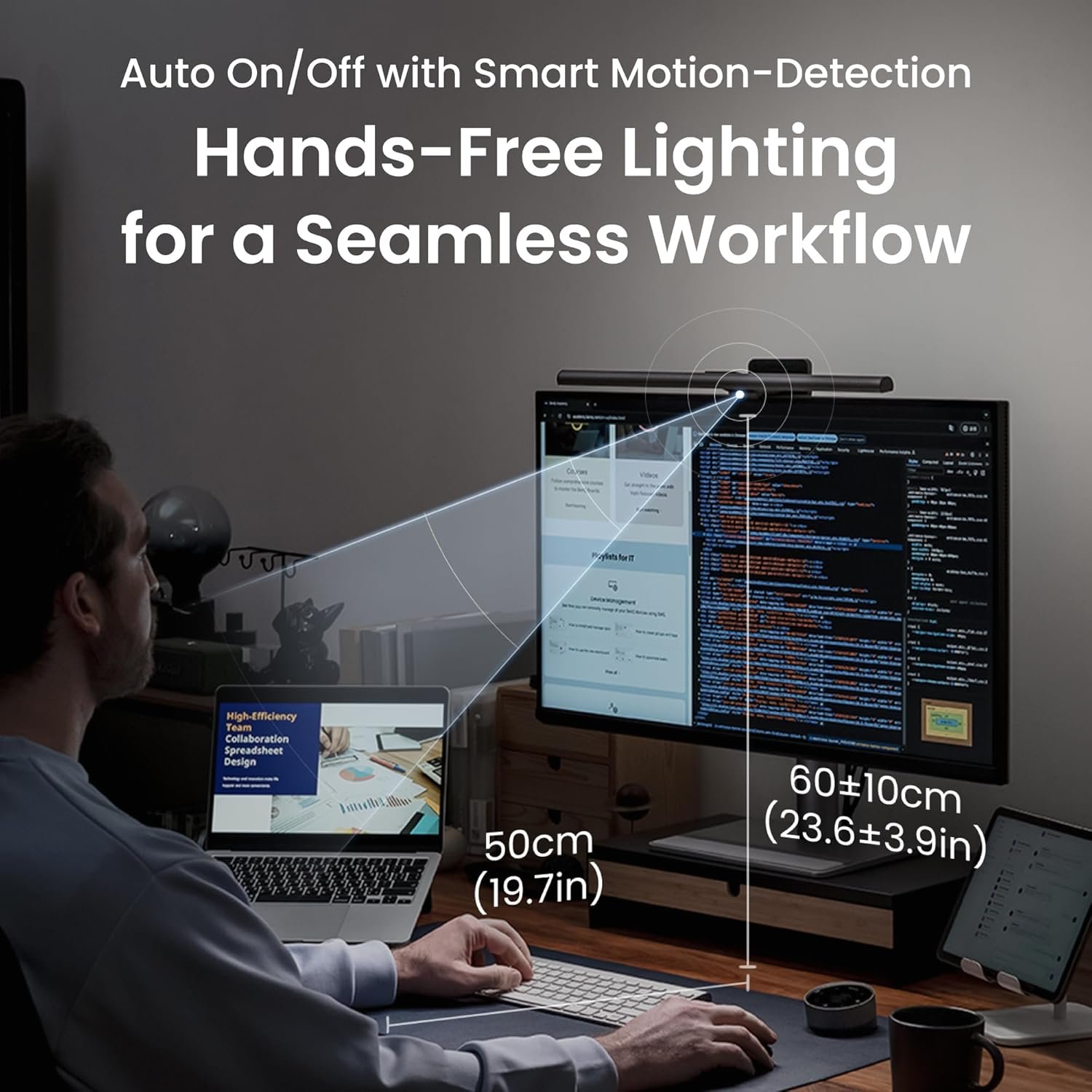 Specially engineered to project light at an 18° anti-glare angle, the front lamp brightens your workspace without reflecting on the screen or shining into your eyes. Ideal for coding, editing, designing, reading, and gaming setups.