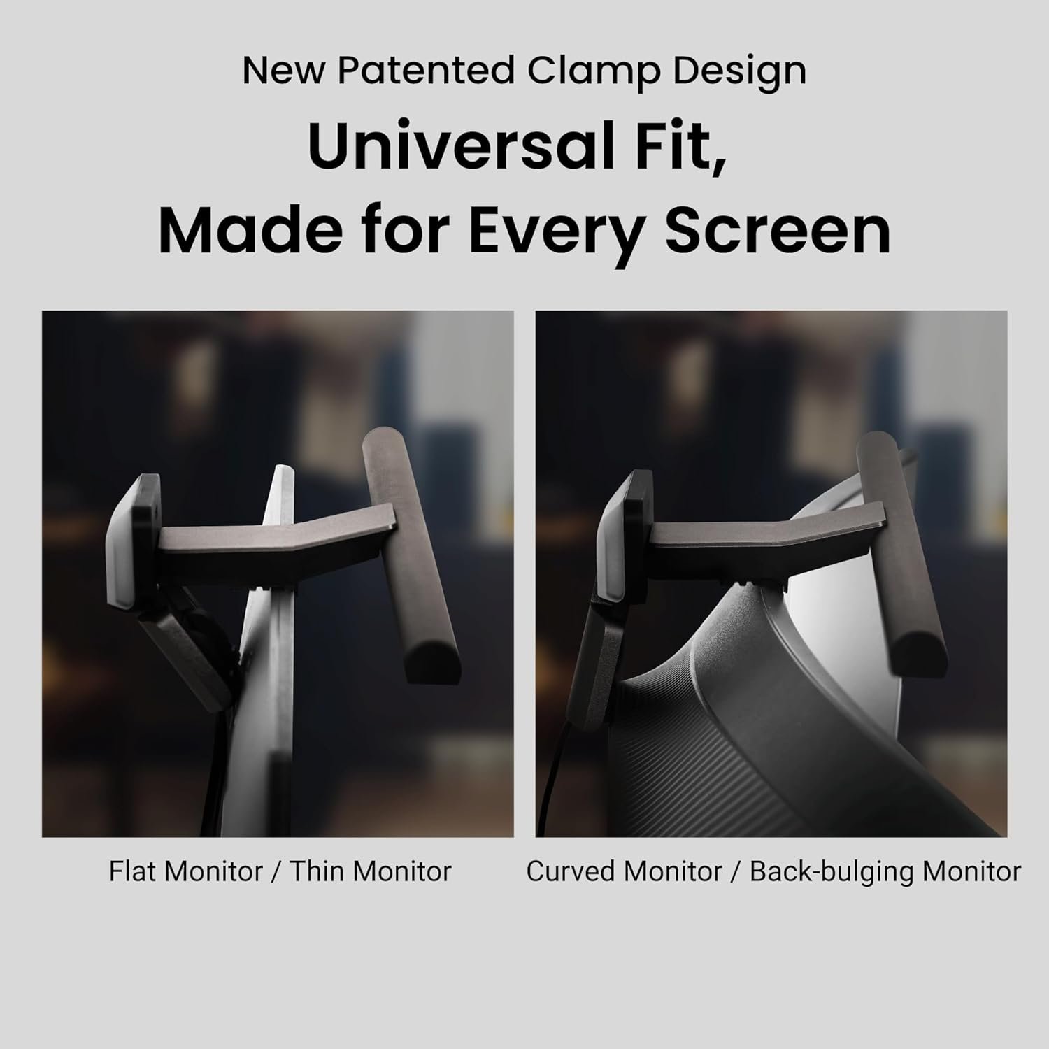 The sturdy weighted clamp fits monitors 0.17″ – 2.36″ (0.43–6 cm) thick, including curved displays from 1000R to 1800R. It attaches securely without damaging your screen and frees up valuable desk space.